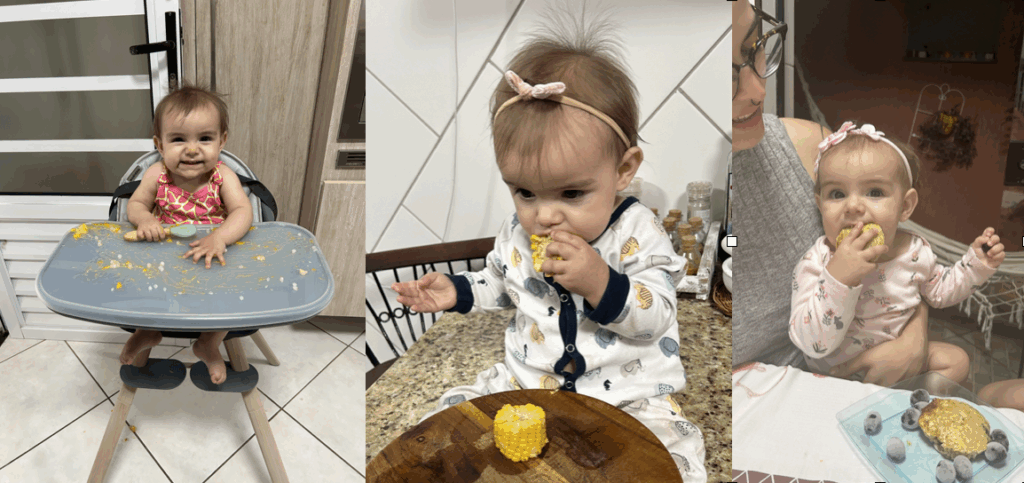 “É hora de papá… e eles já sabiam o que vinha pela frente; agitavam-se com os movimentos da vovó em busca dos utensílios e alimentos. Hummm! Quantos cheiros, cores e nham, nham, nham para os novos sabores. No começo, comendo com as mãos, os alimentos tão apreciados que ao final da refeição boa parte encontrava-se no chão!” (Coletivo Cais)