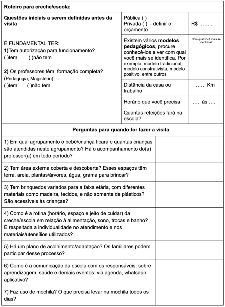 Pensando no tanto de questões que envolvem a primeira visita à creche/escola, elaboramos um roteiro a fim de facilitar a sua decisão, pois, sabemos que são muitas as dúvidas e que ter um roteiro em mãos ajudará no momento da escolha.