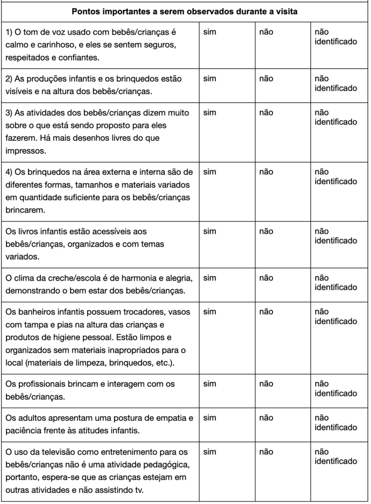 Sabemos que nem todos os aspectos que uma visita requer, estão abordados neste roteiro, mas, aqui você encontrará o mínimo necessário para apurar seu olhar sobre o cotidiano da creche/escola quando for conhecê-la. Então vamos ao roteiro: